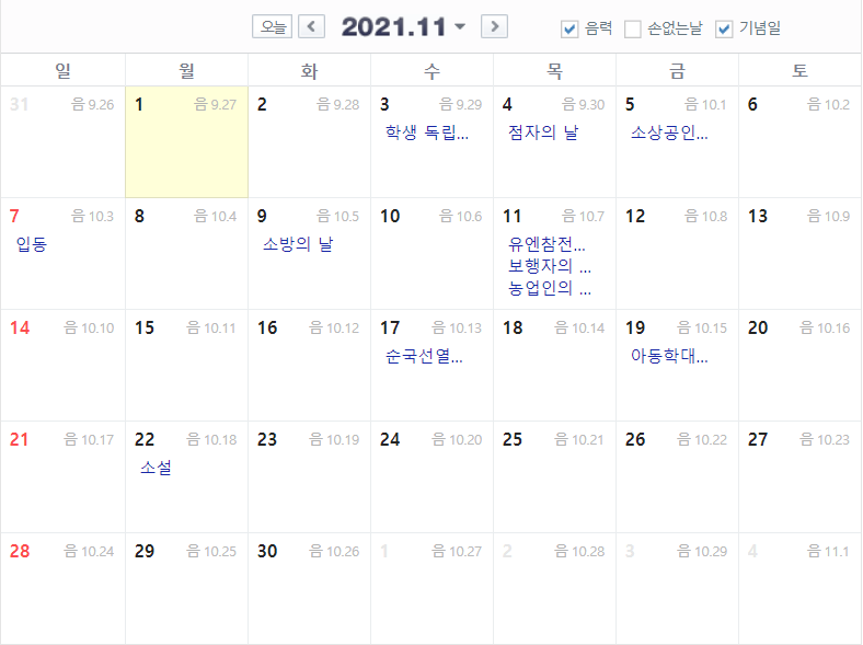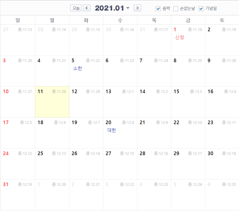 11월 음력 달력