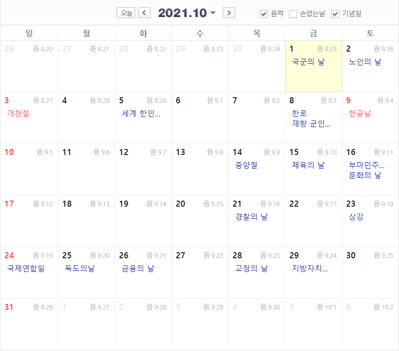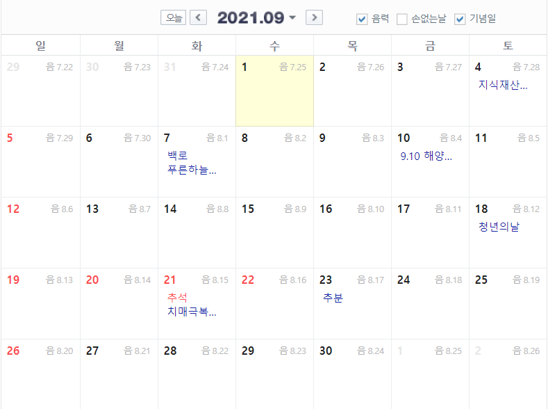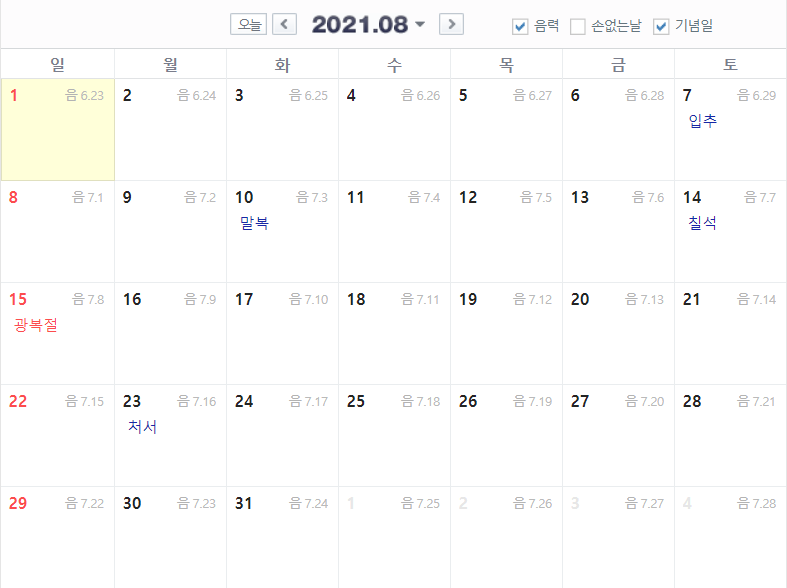 2021 8월 음력 날짜