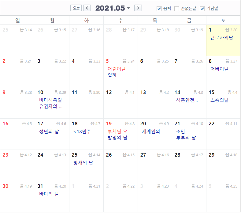 2021년 5월 음력