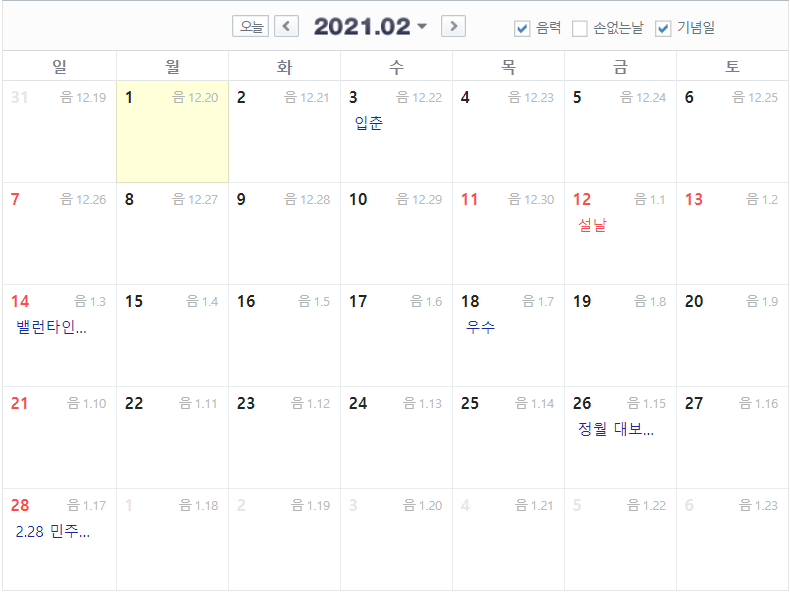그리고 구정, 신정 등 아직 음력달력이 필요한 날들이 몇몇 있습니다. 그래서 오늘은 2021년 음력달력을 한 달씩 볼 수 있도록 준비했습니다.