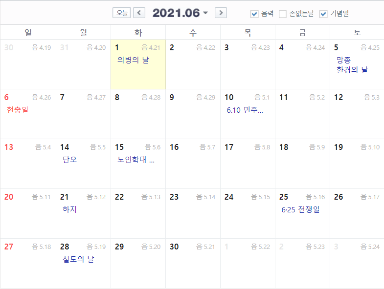 2021 6월 음력 날짜