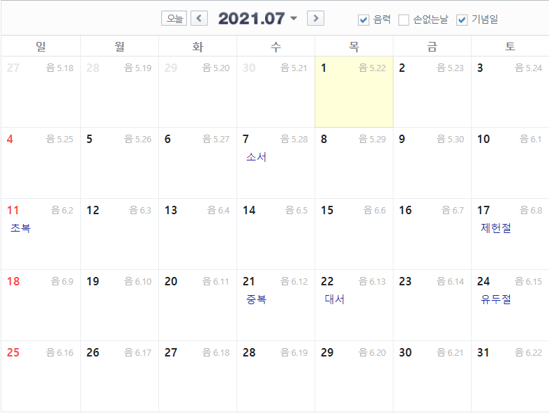 2021 7월 음력 날짜
